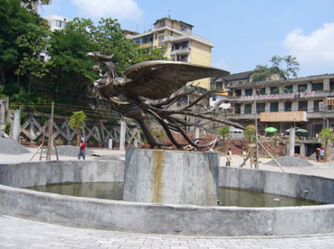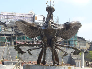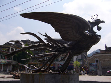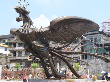 對古城的另一種破壞是“新景觀”。目前在新舊城的接壤處正在建一個廣場,現(xiàn)代化的水泥柱正拔地而起,一座用黃銅鑄造的“鳳凰雕塑”挺立在廣場的中央。遺憾的是,此“鳳凰”(見圖片)造型完全打破了人們對這只吉祥鳥的美好想像。正如來自上海和香港的游客所形容看過后的感受,像一只“落湯雞”,完全不能與古城相匹配。