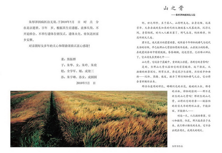 每個人手里都握有一份小柬,上面除了夫人熊振群率子孫告知大家:“朱厚澤因病醫(yī)治無效,于2010年5月9日在北京逝世,享年80歲。根據(jù)其生前遺愿,喪事從簡,不開追悼會,不舉行遺體告別,遺體火化,骨灰送回家鄉(xiāng)安葬。對親朋好友多年的關(guān)心和幫助以衷心感謝!”不足百字的訃告外,上面還有一篇朱厚澤致南國友人的信“山之骨”,文字不長,然才情四溢,激情澎湃。難掩他一腔的家國之思。內(nèi)頁和封底刊有朱厚澤的兩幅攝影作品:一幅是一望無際的麥田;另一幅是一棵蒼天大樹的根部。