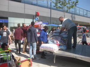 在維也納的難民安置營(yíng),情況卻不一樣。在維也納主火車(chē)站的一端開(kāi)辟了接待安置點(diǎn),難民們有序地得到登記,得到食品、衣物、鞋帽、毯子等等,然后有序地乘車(chē)離開(kāi)被送往德國(guó)。大批的市民絡(luò)繹不絕地送來(lái)各種物品,大批的自愿者在此服務(wù),一看都訓(xùn)練有素。安置點(diǎn)周?chē)O(shè)置了醫(yī)療站(在汽車(chē)上);臨時(shí)廁所(在汽車(chē)上)我注意到不僅內(nèi)置了洗手的水池,還提供女性用的“衛(wèi)生巾”。這里沒(méi)有攝像機(jī)跟隨,沒(méi)有記者采訪,只有我不停地用我的傻瓜相機(jī)拍照。我試圖采訪難民,但他們不懂英語(yǔ)。我與幾位警察和志愿者做了簡(jiǎn)單交流,得知政府發(fā)布了信息,市民們?nèi)渴亲园l(fā)地前來(lái)捐衣捐物,還有食品、水果、水、蔬菜等等。一位志愿者說(shuō),今天是星期天,所以前來(lái)參加志愿服務(wù)的人很多。難民很可憐,戰(zhàn)爭(zhēng)使他們失去了家園,他們是無(wú)辜的。