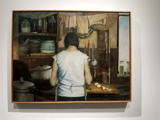 大廳內(nèi),一群成年學(xué)生在一位老師的帶領(lǐng)下,駐足在陳丹青“藏民”的畫作前講解著,說是陳丹青早期的作品。特別介紹了油畫對光線的運(yùn)用很重要,也很考驗一個畫家的功力。那群學(xué)生看上去聽得也蠻認(rèn)真。想來可能他們是學(xué)藝術(shù)的。 那幅題名為《看電視》的油畫,立刻把我?guī)肓硕兰o(jì)七十年代末八十年代初的歲月。那時中國人剛剛有了電視,誰家有了電視(僅僅9寸或12寸的黑白)都會引來鄰家孩子們安靜地聚集在一起的時刻,沒有誰家會拒絕。 (畫作:《看電視》) 我的第一臺電視是我的一個叔伯哥哥,當(dāng)時他是鐵道兵某師師長花了大約五百元,給我買了12寸的電視機(jī),一下子讓我的日子進(jìn)入了“萬元戶”的水平。當(dāng)時我的月工資34塊錢。那一年是1979年。 當(dāng)時我的單位也有了一臺20寸彩色“日立”牌電視機(jī),每天主要節(jié)目是由當(dāng)時的北京外國語學(xué)院鄭培蒂老師講授英語課程,我的英語就是通過電視跟著鄭培蒂老師學(xué)了兩年,并獲得了“英語單科畢業(yè)證書”。鄭培蒂老師端莊、優(yōu)雅的形象,以及字正腔圓的英語給我留下了深刻的印象。不知鄭老師現(xiàn)在在哪里? 還有一張《母親》的油畫。畫家選擇了母親立于老舊廚房中背影這個視角。站立于畫作前我不禁淚水流出,想起在兩年前過世的母親。 我的母親是“勤儉持家”的楷模,街坊鄰居都是這樣夸獎她。最深的記憶是,在六十年代初“三年自然災(zāi)害”期間,許多家庭缺衣少食,而我的母親靠著勤勞節(jié)儉讓我們七姊妹沒有挨過一頓餓,而且在每年大年三十晚上都有一身新衣褲和一雙新鞋子擺在每個孩子面前。這些活計都是她平日里下班之后悄悄做的,過年之際給孩子們驚喜。每逢學(xué)校春游還是秋游,母親都會蒸出“紅糖大饅頭”,外加一個雞蛋給我們帶上。我們姊妹都受母親的影響,從十多歲起,開始分擔(dān)母親的家務(wù)。我記得我每天做晚飯時,每頓飯的米要用稱稱,不能多,秤桿是平的。母親過日子的計劃性、節(jié)儉性、儀式性、體面性也塑造了她的孩子們?nèi)蘸蟮钠犯瘛?/span> 這幅《母親》的畫作真實、平實、素樸,畫面中出現(xiàn)的高壓鍋記錄的應(yīng)當(dāng)是二十世紀(jì)八十年代的廚房,看了倍有代入感和親切感。作品還原了生活、還原了歷史,升華了藝術(shù)感染力。