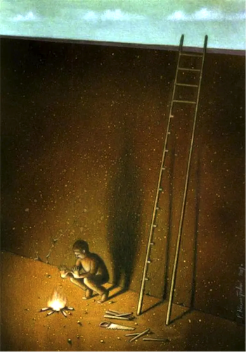 (最愚蠢的事情不是摔進(jìn)陷阱沒有梯子可以逃出來,而是梯子擺在那里我卻把它拆了當(dāng)柴燒。圖片選自智多漫:揭露麻木思想的漫畫。https://baijiahao.baidu.com/s?) |