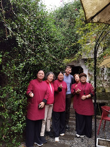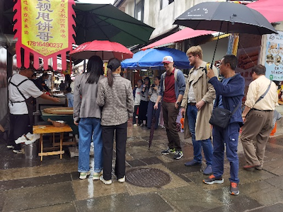 (朱紅主任右二與大家合影) 兩位挪威學(xué)者大開眼界,古村落、美食和各種手工藝品尤其吸引他們??缥幕芯恳暯亲屗麄儗?duì)多元文化價(jià)值的理解、認(rèn)同,以及美的欣賞有了更實(shí)在的“現(xiàn)場(chǎng)”收獲。他們表示,將來會(huì)帶領(lǐng)他們的家人或鼓勵(lì)更多的歐洲人到蘭溪古鎮(zhèn)看一看。他們還對(duì)游客群體消費(fèi)傾向做了觀察。 在兩天的田野考察中,我們也特別關(guān)注了村民“菜園子”的種植情況,以及民風(fēng)中的勤勞節(jié)儉的習(xí)尚與傳統(tǒng)。